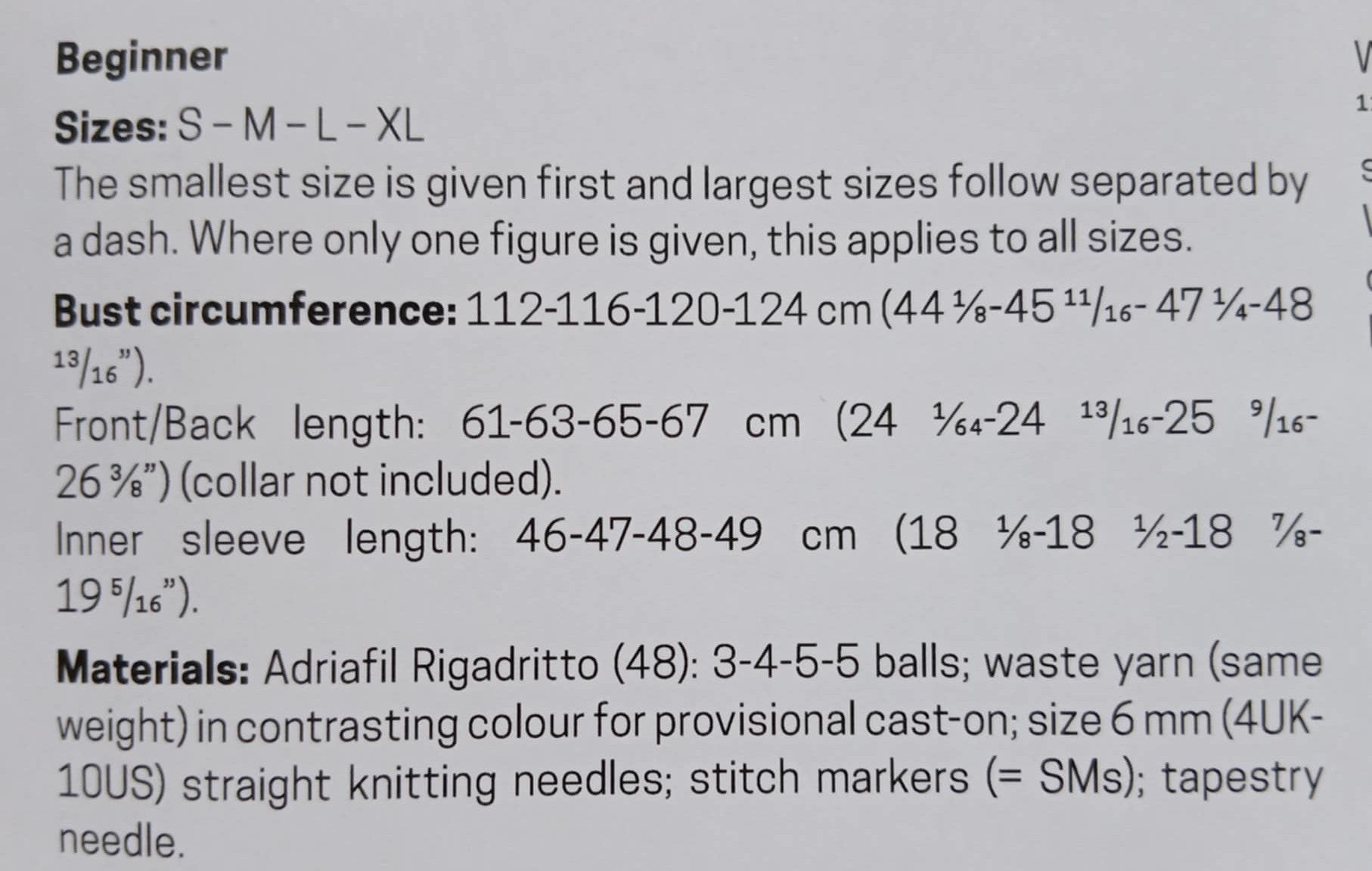 Fits from S to XL, again the measurements are show in the image (NB: The measurements are the actual measurements of the finished garment). You'll also need 6mm knitting needles and some stitch markers.