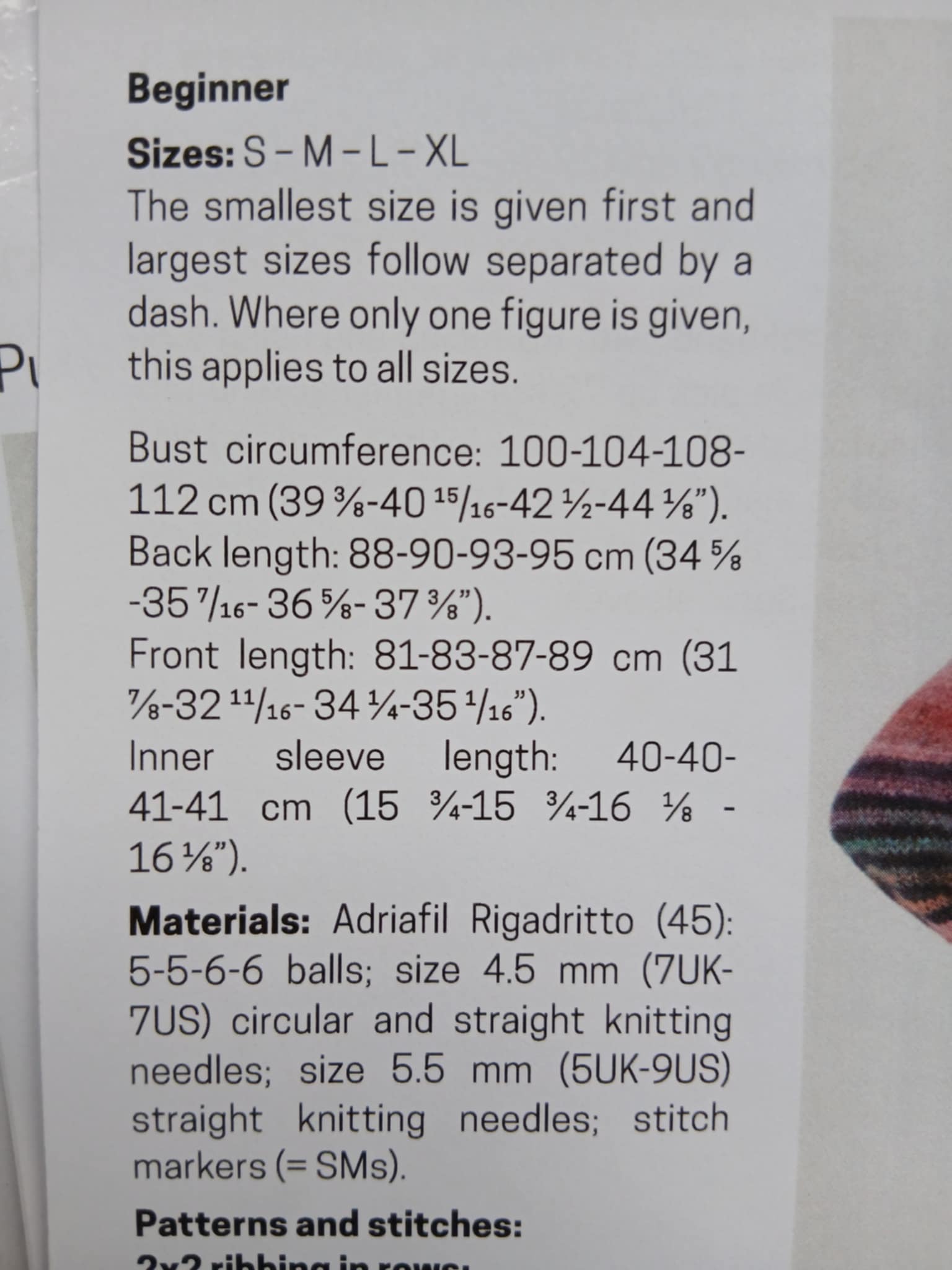 Fits from S to XL, again the measurements are show in the image (NB: The measurements are the actual measurements of the finished garment). You'll also need 4.5mm and 5mm knitting needles and 4.5mm circular needles as well as some stitch markers.