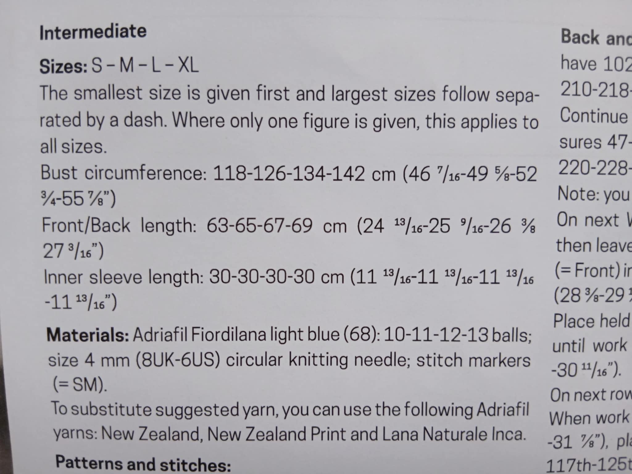 Fits from S to XL, again the measurements are show in the image (NB: The measurements are the actual measurements of the finished garment) along with needle requirements.